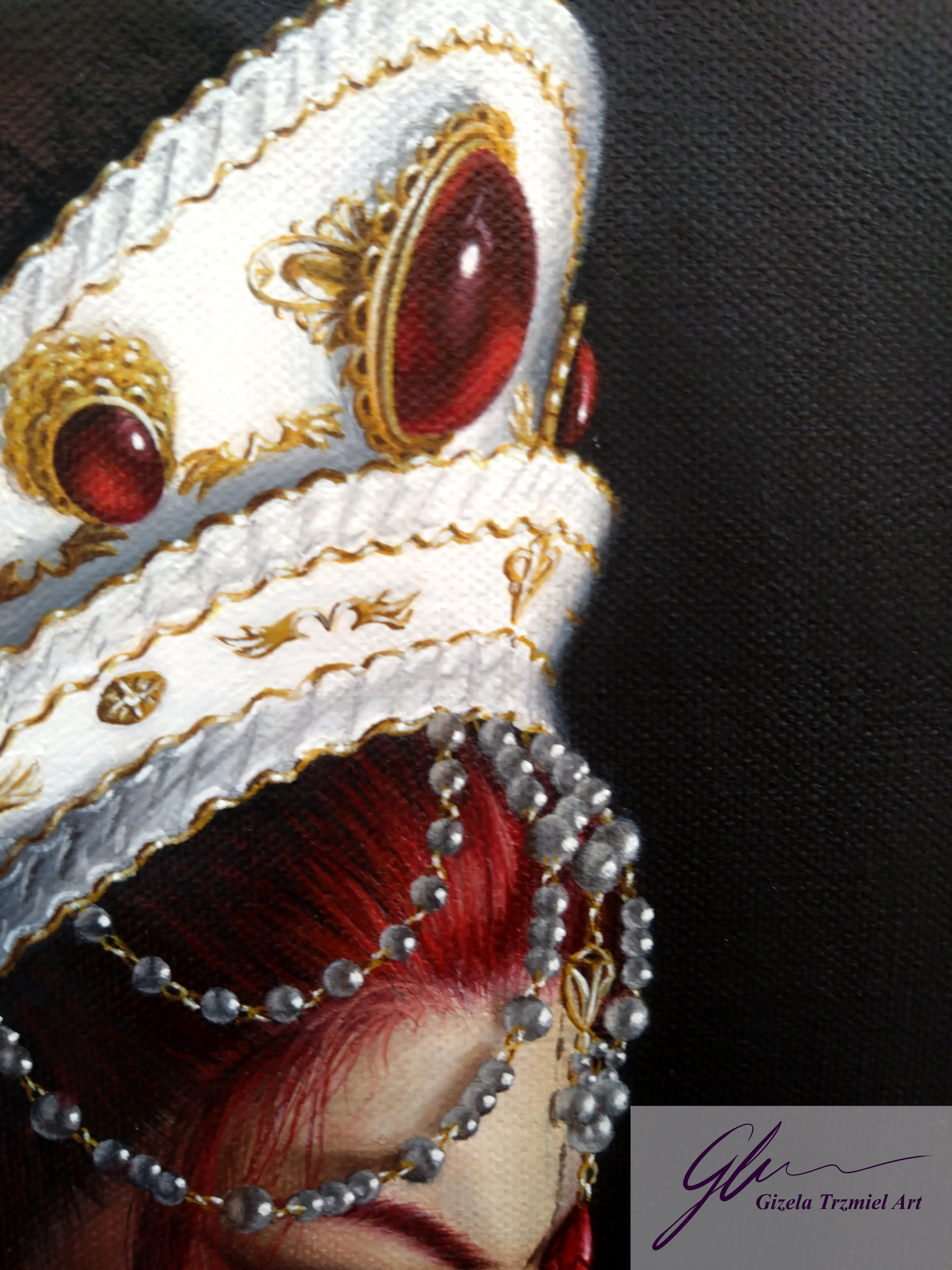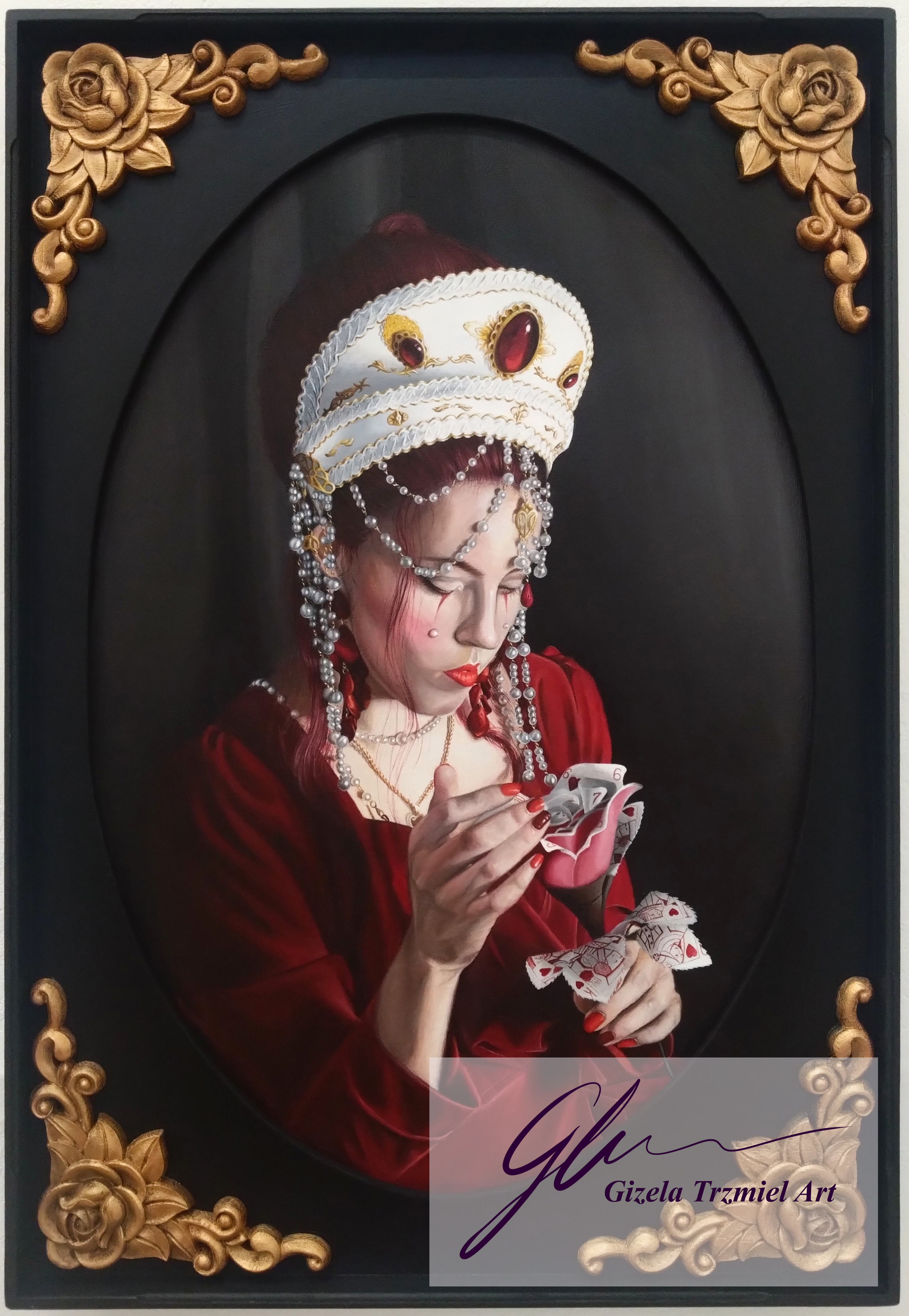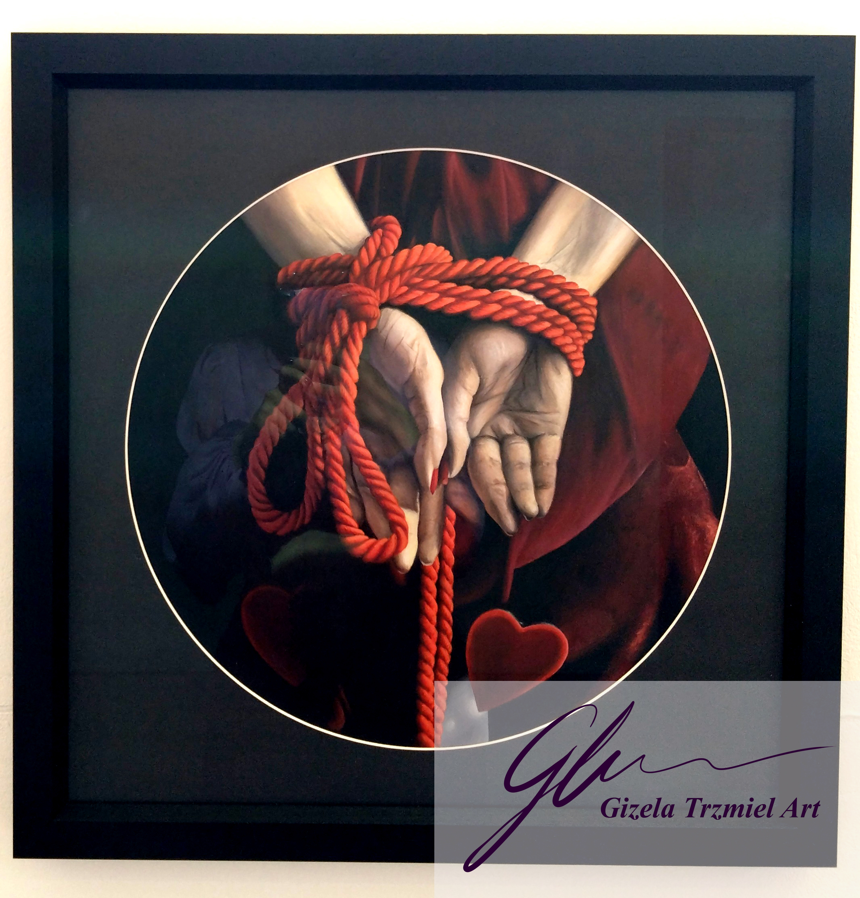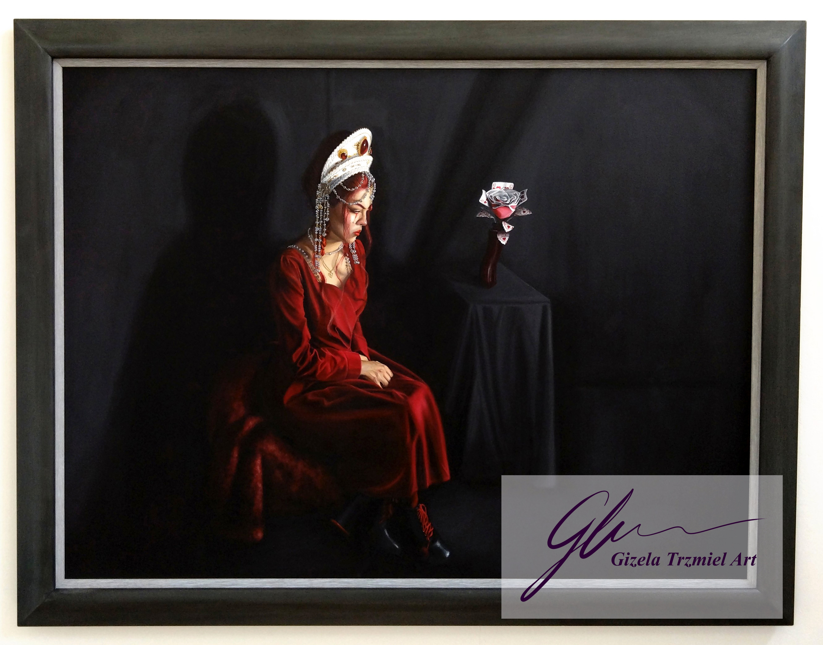 This series of works was completed in the artist’s final year of university. In these self-portraits, the artist represents herself as two separate alter egos. These personas are based on the Red and White Queens from Lewis Carroll’s ‘Through the Looking-Glass: And What Alice Found There’. They represent duality or inner conflict – conflicts of love and hate, of spiritual and material, of needs and wants, which we all experience. This investigation of the self is an exorcism through the reopening and healing of old wounds.